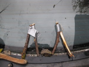 В ходе дорожных испытаний, была выявлена некоторая недоработка конструкции. Я разогнался до предельной скорости в 30 кмч и спойлер оторвало встречным потоком воздуха. Я остановился на обочине и пошёл в лес за необходимыми строительными материалами. Далее фотки уже готового результата.