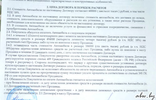 — На сайте одного московского автосалона мы нашли Toyota в стандартной комплектации за 560 тысяч российских рублей, — рассказывает Сергей. — Позвонили в салон, нас заверили, что данная модель в наличии, стоимость ее не изменилась и по-прежнему составляет 560 тысяч. Когда пришли в автосалон, нам объяснили, что автомобиль, который нас интересовал, отсутствует на складе, предложили взять эту же модель, но сустановленным дополнительным оборудованием. Стоимость машины уже выросла до 600 тысяч. Согласились, так как все равно выходило дешевле, чем у белорусских дилеров. Подписали предварительный договор, в котором было указано, что стоимость автомобиля равна 600 тысяч, включая дополнительное оборудование и торговую надбавку. После чего внесли залогв размере 30 тысяч российских рублей.