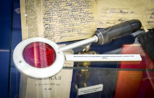 Мало кто знает, но на самом деле жезлы сотрудников ГИБДД бывают двух типов — привычный черно-белый и дисковый с красной точкой (светящейся или светоотражающей). Интересна и его история. Как рассказали нам в Музее Госавтоинспекции в Москве, изначально этим жезлом пользовались сотрудники ГАИ для остановки других участников движения при движении организованной колонны.