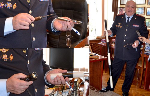 Сейчас же попытка встроить в «полосатую палочку» что-либо, кроме подсветки, воспринимается уже как экзотика. Но таких экспонатов в коллекции Александра Викторовича тоже немало! Например, жезл со встроенным фонариком и электошокером или жезл с… ножиком. «Это — не для самозащиты, а, скорее, колбаски после работы порезать», — шутит главный гаишник Курской области.