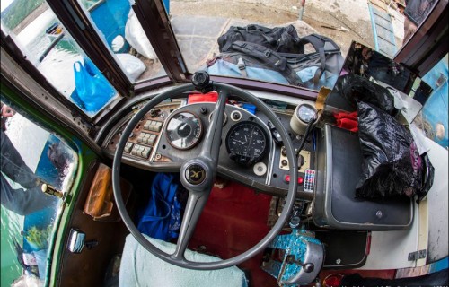 Когда я говорил, что к лодке просто приварили салон ЛАЗа с кабиной, я нисколько не шутил. Внутри это действительно полноценный автобус. Сиденья, шторки на окнах, багажные полки…