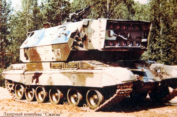 Первая и единственная машина была выпущена в 1990 году и внешне напоминала «Стилет», но только внешне. За те 10 лет, которые прошли между выпуском этих двух машин, объединение «Астрофизика» превзошло само себя и полностью модернизировало лазерную систему. Теперь она состояла из 12 оптических каналов, каждый из которых имел индивидуальную и независимую систему наведения. Сделано это нововведение было для уменьшения шансов противника защитить себя от лазерной атаки с помощью светофильтров. Да, если бы излучение в «Сжатии» происходило из одного или двух каналов, то условный пилот вертолета и его машина могли бы спастись от «слепоты», но 12 лазерных лучей разной длины волны сводили их шансы к нулю.
