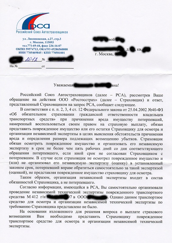 Отчет об оценке мы сдали в страховую, и тут страховая решила его проверить, прислав для повторного осмотра машины некоего «своего эксперта». И ко мне в гараж пришел некий странный гражданин с самодовольной рожей и геодезической линейкой, представившись: «Я типа эксперт». Он попрыгал вокруг Москвича пару минут, что-то пометил в своем блокноте и убежал. А через несколько дней страховая заявила, что машину мы им плохо показали и поэтому у нас не страховой случай. Написали жалобу в контору РСА на Люсиновской. Какие бумажки им послал им на проверку РосГосСтрах доподлинно не известно, но ответ, пришедший месяцев через полгодика, был всё о том же – не страховой случай и идите отсюда, собственно вот их ответ. Надеюсь, никто не обидится за то, что я замазал персональные данные: