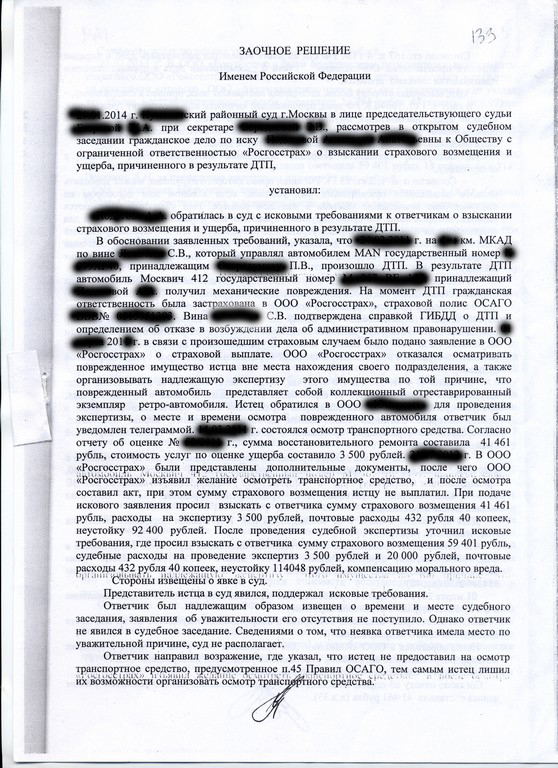 А юристы страховой видимо шаблонно полагая, что Москвич машина убогая, не воспринимали нас всерьез, а когда им выдали уточненное исковое заявление видно всё же догадались куда дело идёт и решили не ходить в суд для затягивания процесса – при неявке стороны по делу судьи обычно переносят заседание на месяц и такое иногда бывает раз по много. Но мы заявили, что надо выносить заочное решение и судья с нами согласилась отложив заседание только раз. А когда страховщики в суд опять не явились судья, выполнив все формальности (типа вопросов о поддержании нашего иска) удалилась в совещательную комнату и через часок вышла и огласила решение, в котором удовлетворила наш иск. При этом судья сама явно испытывала большое удовольствие, может быть, потому что страховщики ее достали, а может потому, что понимала — данный процесс создал прецедент…
