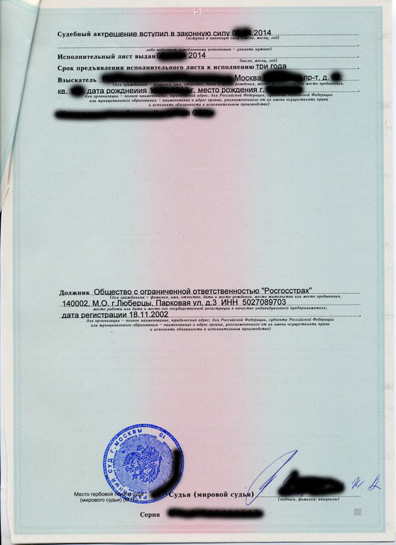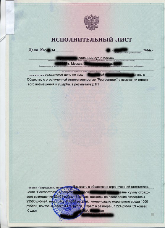 И тут суд выдал нам исполнительный лист. А страховщики видимо поняли, что не на тех напали и уже без всяких фокусов его приняли и всё оплатили, а именно: