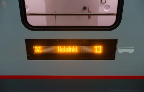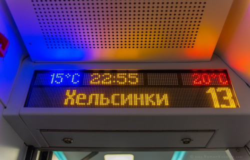 Информационное табло в вагоне. По России поезд делает остановки только в Твери, Питере и Выборге, на Финской стороне, как обычно, превращается в междугородный поезд и совершает ещё 5 остановок до прибытия в Хельсинки.
