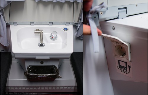 Под столиком прячется раковина с сенсорным краном и регулятором температуры. А ещё пара розеток на 220 вольт. Чем больше я исследовал купе, тем больше удивлялся — ведь могут же! Интересно, на какие ещё направления ФПК пришёл уже такой прогресс?