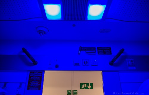 Один из двух режимов освещения превращает купе в приватную комнату какого-нибудь ночного клуба. В чём смысл этого режима я не очень понял, видимо, такое освещение не должно будить спящих пассажиров, если одному из них понадобился свет. Хотя, может это ультрафиолет для уничтожения бактерий?