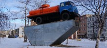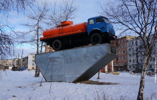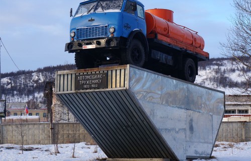 В Хасынском районе работниками Палаткинской автобазы был сооружен новый пвмятник «Автомобилю-труженику». На постамент был водружен автомобиль МАЗ-500. Справедливости ради, надо сказать, что это не новый, а модернизированный атопамятник, поскольку ранее в 1983 году здесь был установлен раритетный МАЗ-200, который сейчас перемещен к стелле на въезде в поселок Палатка. А на освободившее место установили винтажный МАЗ-500. Однако старая надпись  «Автомобилю-труженику, «1933 — 1983» тут так и сохранилась, где «1933»  — означает год рождения Палаткинской автобазы, «1983» — год полувекового юбилея автобазы, когда и бы установлен автопамятник.