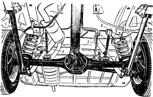 Основной особенностью оригинальной подвески FIAT 124 является Т-образный мост. У такого моста в «чулки» спрятаны не только полуоси, но и сам карданный вал. Именно этот длинный чулок, названный в тексте реактивной трубой, удерживает мост от проворачивания. Однако такая схема имеет существенный недостаток: имея одну из точек крепления в центре, а с другой стороны находясь в зацеплении с тягой Панара, мост начинает подруливать. Причем паразитные подруливания происходят не только в поворотах, но и вообще при работе задней подвески. А так как форма у моста Т-образная, то такое подруливание оказывается совершенно нежелательным. У «жигулей» вместо «чулка» кардана появилось два дополнительных верхних рычага, которые не только не дают мосту провернуться, но и предотвращают паразитные подруливания.