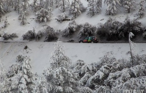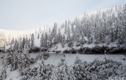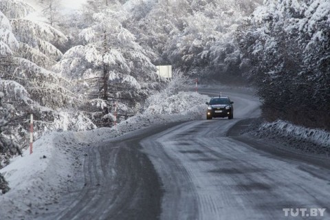 На снимке от пропасти машину отделяет небольшая снежная крошка — и так во многих местах. Где-то после недавних ремонтов оградки появились, где-то нет.