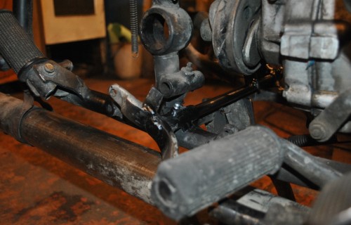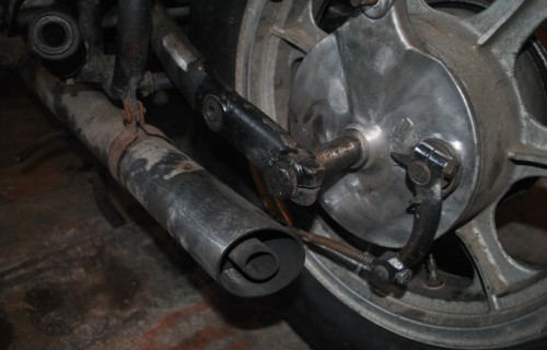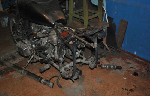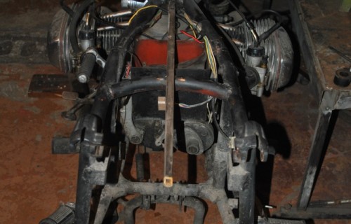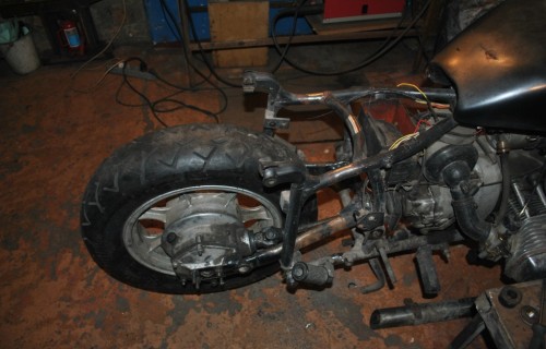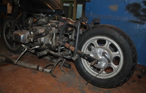 МТ был пригнан ко мне, покрутившись возле мотоцикла, я подумал, что работы не так уж и много.Разобрать, расширить маятник, расширить раму, перенести рычаг лапки тормоза, переделать крепления заднего крыла, покрасить и собрать. Ну, что? Понеслась? Снял заднее колесо, маятник, аморты, отметил ось мотоцикла.