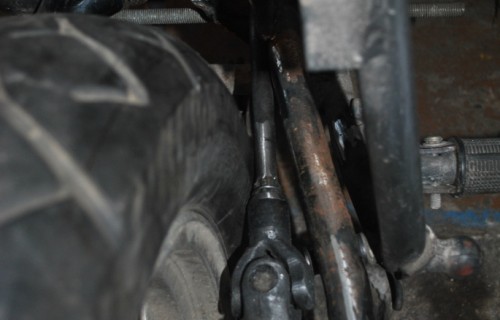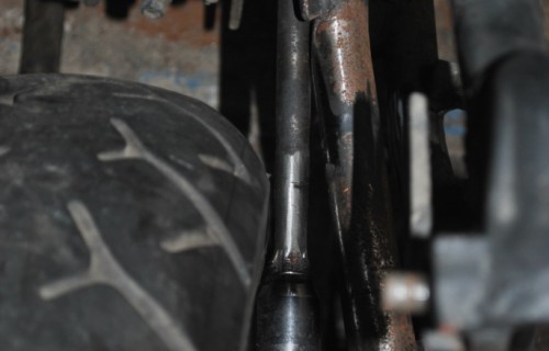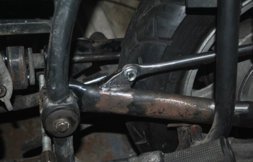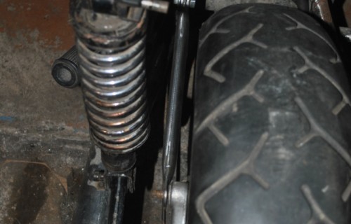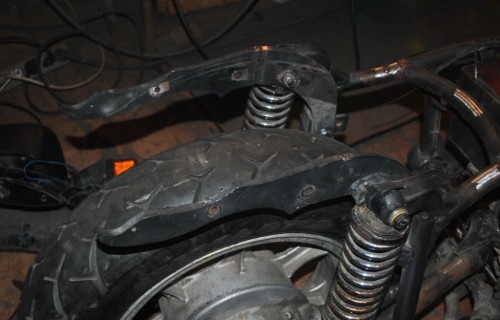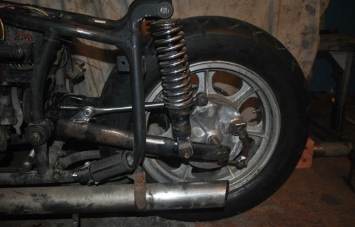 Воткнул криво сваренный (ну может не было у человека приспособ, чтоб ровно сварить) маятник, установил колесо, чисто для полюбоваться. Ось колеса в отверстия маятника не попадает, не беда, болгарка/сварка вылечит. А так как заблаговременно была вварена шлицевая в имевшуюся ступицу, проблем с установкой на мост вообще не возникло. А…чуть не забыл, пришлось немного (55 мм) расширить раму, заднюю часть – там где крепятся амортизаторы, дабы они стояли вертикально.