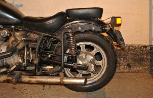 Полечив кривизну маятника, я добился идеальной установки колеса в маятник и решил показать Мишане великолепные свойства родной рамы МТ превращаться в круизер и бобер, притом заменяя всего лишь одну деталь – бак (ну и выбрасывая заднее крыло))). Итак – круизер: