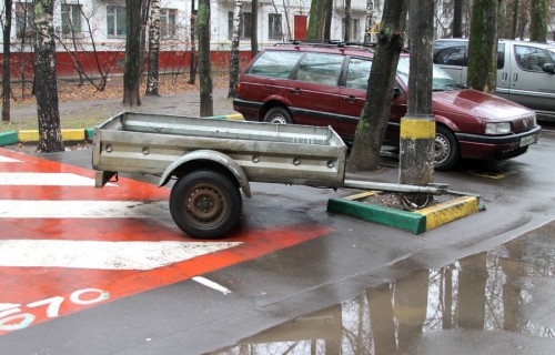 По приезду «основной» машины прицеп заталкивают на газон и паркуются перед ним.