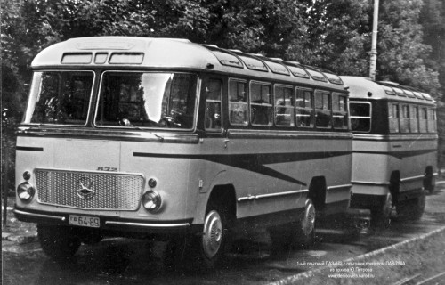 1959 год, первый опытный ПАЗ-672 имел другую облицовку радиатора и вообще заметные отличия в дизайне. Позади на сцепке — пассажирский прицеп ПАЗ-750, который планировали использовать в паре с автобусом.