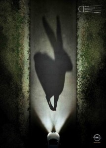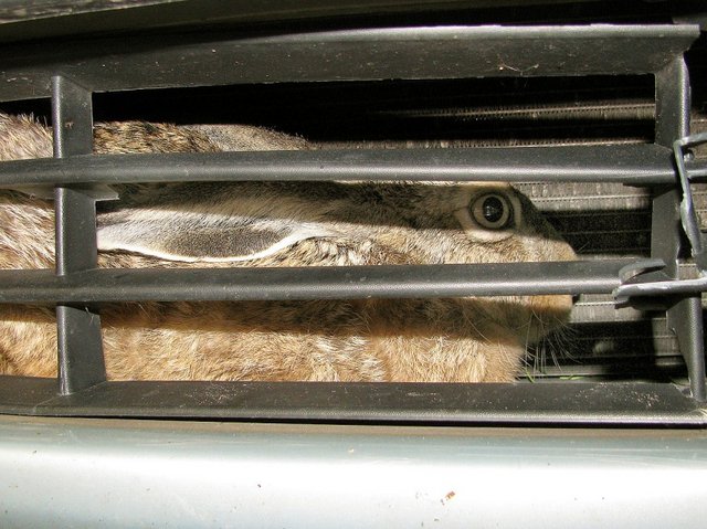 На следующее утро жена Вильгельма — Сандра только собралась ехать на машине за покупками, как услашала шуршание и поскребывание под капотом. Позвала мужа, приготовились изгонять куницу (любят эти собольи родичи изоляцию с кабелей обгрызать) а тут заячьи глаза из под бампера смотрят. При столкновении заяц пробил пластмассовую решетку радиатора, которая за ним снова закрылась. Очухался, погулял туда-сюда, заскучал* и давай на волю выцарапываться.