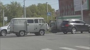 Новосибирск. Ул. Военная. Водитель джипаря решил поучить УАЗик. Но он наверняка никак не ожидал, что в нем еще кто-то едет.