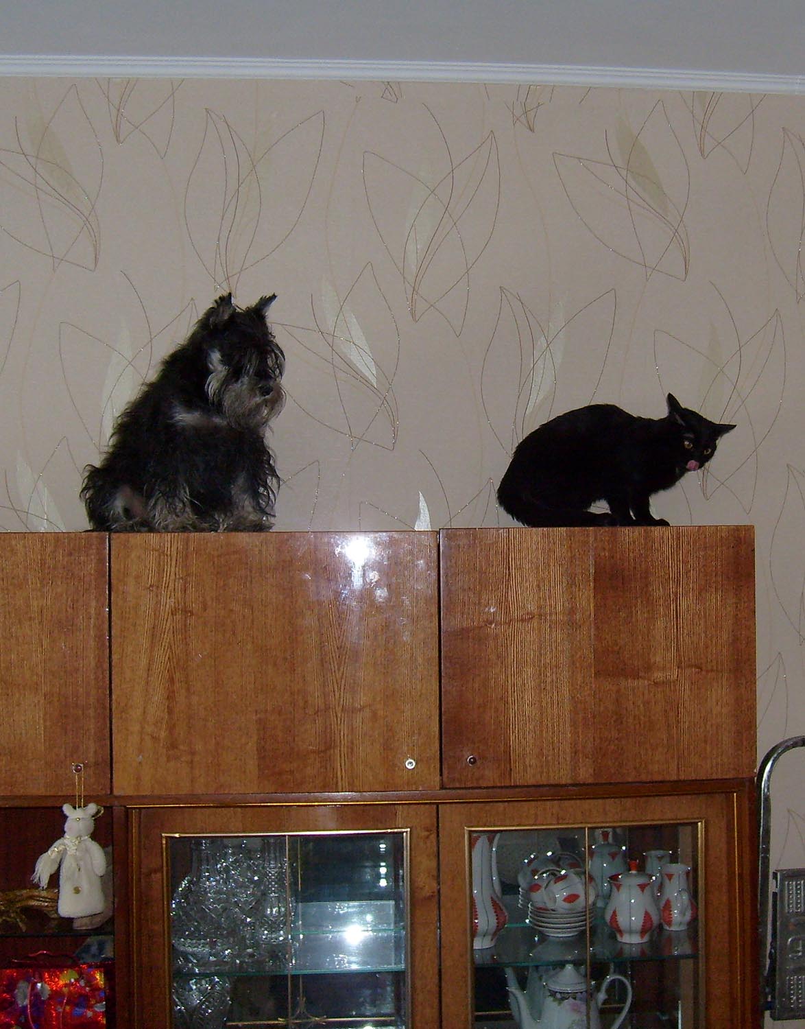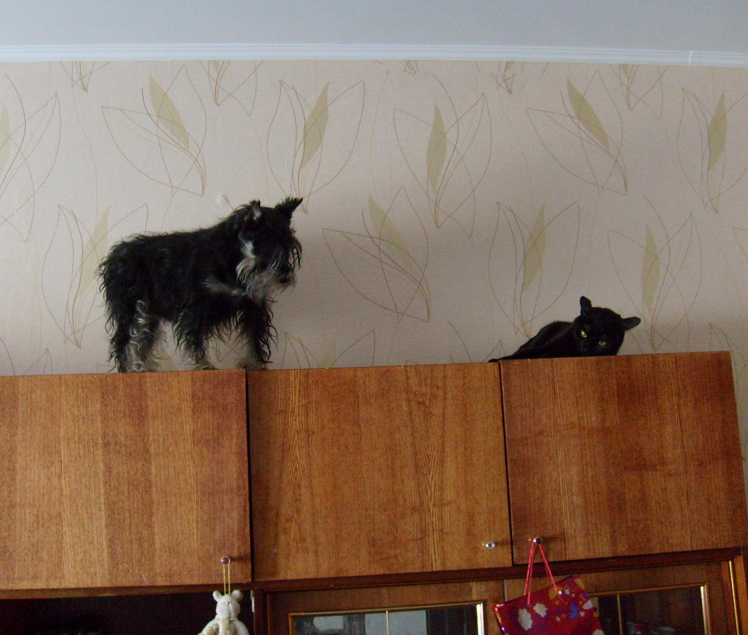 "Кошка, ты попала!" - думала собака, попав на шкаф.