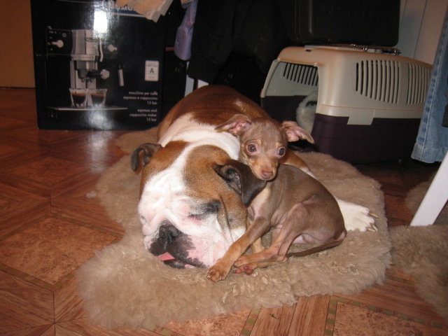 =))) малясь наших животинок=))) бульдошка и мини той=) живут дружно.