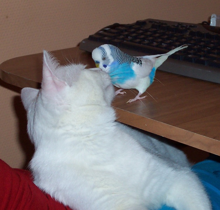 У меня живут кошка Мася и два попугая Аруха и Мира. Мира еще в кадр не попадала, а первые два смотрите ниже. |