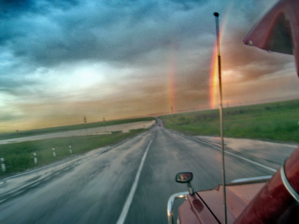 Проснулись около 10 утра. Позавтракали и поехали на СТО. Там поменял масло (у дизеля срок замены масла меньше, чем у бензинки), а заодно и воздушный фильтр. Всего замен с промывкой обошлась в 4300 рублей. Потом заправка (36 литров по 21,40) и на трассу. Пробег перед выездом 216312 Дорога обратно знакома, но немного усложнилась – раньше мы друг друга предупреждали о наличии каких нибудь Шумахеров, или проблем на дороге, а сейчас предстояло ехать одному. Обратили внимание на названия проезжаемых рек. Очень забавные (хотя они и у нас называются по разному). Тимптон, Жижигчин, Шаракупка, Тымбылгун, Тангакан В общем было забавно.. Еще забавнее было то, что с собой наличных денег было только на поесть – и оставалось резервных 500 рублей – это 20 литров соляры – не больше. Все остальное было на карточке. Ближе к вечеру - начал искать заправки – заправки были – но карточки они не принимали – максимум огли принять свои магнитные. Пластик негде не обслуживался. Едем думаем – водка с собой есть, если вдруг встанем – выйдем с пустой канистрой – и будем голосовать – просить соляры до Читы. Где-то после Читы был забавный случай - стоит на встречной обочине БМВ, возле него два взрослы и один ребенок – и голосуют. Думаю, на подставу не похоже – остановлюсь. Подходит человек слегка кавказкой национальности и начинает на ломанном русском объяснять, что он румын. Достает паспорт – протягивает – точно румын. Хм… Просит немного масла для коробки автомата, я ему объясняю – что у меня масло Nissan ATF – и ему очень вряд ли оно пойдет – загубит коробку окончательно. Тогда он снимает с пальца тяжелую печатку (как объяснил -32 грамма золота) – и предлагает мне за 3000 рублей. Русские деньги у него на карточке все, а карточки в этом районе – как я уже говорил – к оплате на заправках не принимают. Я ему объясняю – что у меня только 500 рублей и больше нет. В общем он грустный, тогда просит еды для ребенка – дал ему тушенки и хлеба. Не знаю, думаю с бедой он справился. В Хилке заправились (21 литр на последние 500 рублей) Нам повезло на обратном пути - не доезжая 100 км до Читы – нас встретили наши читинские друзья – Олег с Маринкой. Заняли у них денег – заправили машину и поехали. Вечерело. Перед Читой прошел дождь – и в небе появилось аж две радуги: После проезжали озеро – красивый закат. В Читу приехали поздо вечером – уже село солнце. Но ехать было не тяжело. На этот раз поселились у друзей. Решили завтра провести день в Чите и только послезавтра в дорогу. Когда мы там еще побываем. День 25. Чита. С утра поехали в город.. Гулять по центру. Памятник кому-то По моему тому же Бекетову – который вроде как тоже основал Читу. Потом прошли в парк который находиться за Домом офицеров: И вышли на центральную площадь. Абстрактная скульптура: И фонтан, который больше всего мне напомнил мавзолей %). Может из –за красного мрамора, которым он отделан, а может и из-за чего то другого.. Посмотрели главный Читинский храм: Рядом какое то здание И шикарный железнодорожный техникум. Потом поехали в позную, они есть и в Чите. Попробовали жареные позы – эх, надо было брать обычные – на пару – они вкуснее – а жаренные напоминают обычные пельмени. Там пообедали и в супермаркет –надо было скупиться на обратную доргу – набрали всяких сухариков, чипсов, квасу попить. Пива домой разливного – посидеть вечером, и так по мелочи. Поех