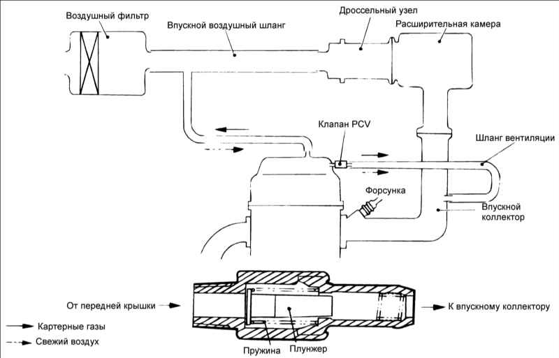 1. У вентиляции картера два "круга": - "Большой" - идёт из картера в воздуховод (до дроссельной заслонки); - "Малый" - из картера во впускной коллектор (после дросселя). На одних ДВС конструктивно выглядит, как шланг идущий непосредственно во впускной коллектор, на других ДВС - в корпус дроссельной заслонки. Малый круг как правило снабжен клапаном PCV или жиклёром, препятствующим поступлению воздуха в картер при избыточном давлении во впускном коллекторе. Малый круг иногда снабжен тройником, раздваивающий трубку из картера на две трубки: одна в воздуховод, другая во впускной коллектор! 2. Как движеться воздух/картерные газы: Когда давление во впускном коллекторе разряженное (ниже атмосферного) воздух засасываеться через большой круг, смешиваеться с картерными газами и удаляеться по малому кругу во впускной коллектор. Однако, когда давление во впускном коллекторе нейтральное или избыточное, то клапан PCV/жиклер перекрывает откачку картерных газов и картерные газы в таком случае удаляются по большому кругу Вот картинго, демонстрирующая графически сей процесс: НО!!! Если износ ЦПГ велик и в картер прорываеться большое количество выхлопных газов, то картерные газы выталкивает не только по малому кругу, но и по большому!!! 3. Что важно: а) Исправность клапана PCV/жиклера. Т.к. в противном случае вы имеете подсос воздуха на ХХ и нестабильную работу ДВС. На наддувных ДВС это грозит ещё и сбросом давления наддува в картер ... На первый взгляд клапан PCV просто железка и его надо всего-лишь промыть, но не забываёте, что клапан это ... пружина, а пружина это ... усталость металла и соответственно потеря свойств со временем ... Каждому своё, но я придерживаюсь мануала и меняю это клапан, тем паче при его цене в 136 рублей! С жиклером ещё интересней! Многие думают, что это просто трубка и не замечают в ней жиклера! Поэтому могут поменять заводскую трубку с жиклером на просто трубку ... Полагаю, что очевидные результаты такой замены расписывать ни к чему. б) В холодное время года сделать невозможным / следить за перемерзанием трубок вентиляции картера (сапуна), т.к. в противном случае давление картерных газов, будучи не имеющих выход, может не только выкинуть масло из картера, но и повышибать сальники ... в) Периодически чистить "последствия" вентиляции картера, а именно смолистые отложения на дросселе. Чтобы максимально минимизировать эти отложения рекомендуется ставить маслоуловитель. г) ... и пожалуй самое грустное P.S. Ни в коем случае не претендую на "истину в последней инстанции"!!! -------------------- «Ад и рай – в небесах», - утверждают ханжи.