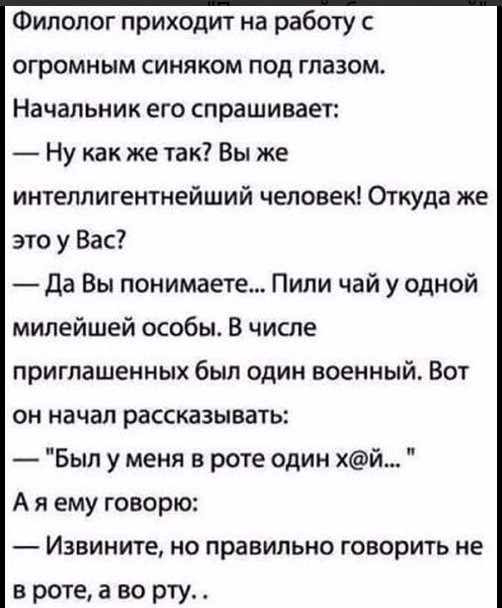 "Я ВЗЯЛ ПОЛТОРАШКУ ПИВА" НА "Я ВЗЯЛ ТРИ ПИНТЫ ПИВА" -И ВОТ ВЫ УЖЕ НЕ БУХАЮЩИЙ ГОПАРЬ, А АНГЛИЙСКИЙ ЭСТЕТ — Пришел муж пьяный, говорит жене: — - Дай попить! — Она наливает ему стакан сока. Он: — - Мне нужен свежевыжатый! — Она выливает сок на стол, вытирает его тряпкой, выжимает обратно в стакан... — - На, пей с@ка, не обляпайся... — Учительница попросила детей рассказать, кем работают их папы. Все ответы были типичными: полицейский, пожарный, продавец, сварщик, директор компании и т.д. Но один мальчик, Костя, на удивление сидел тихо, и учительница попросила его тоже рассказать, как отец зарабатывает на жизнь. — Мой папа танцует эротические танцы в гей-клубе и снимает с себя одежду перед другими мужчинами. Иногда, когда ему хорошо платят, он даже спит с ними в отелях. Учительница, чтобы отвлечь детей, быстро дала им задание, а сама отвела мальчика в сторону и спросила, правду ли он сказал. — Нет, — ответил Костя. – Он – футболист, и играет в нашей сборной, но мне было просто стыдно признаться в этом. Звонят на биржу труда из строительной конторы: — Нам нужен маляр. — Маляров нет. Есть гинеколог. — Да нам маляр нужен! — Ну, он и маляром может. Просто ему очень деньги нужны. Взяли его. Через день опять звонят: — Пришлите, пожалуйста, еще двух гинекологов. — А зачем вам еще двое? — Понимаете, вчера пришли мы на объект, а дверь закрыта. Так ваш гинеколог за два часа нам всю квартиру через замочную скважину обоями оклеил! У нас на заводе есть примета: если главный инженер кричит, значит, опять собрали не трактор. А что собрали? А что кричит, то и собрали. - СКОЛЬКО ВАМ ЛЕТ? –спрашивают женщину. - сейчас ПОДСЧИТАЮ... КОГДА Я ВЫХОДИЛА ЗАМУЖ, мне БЫЛО 20 лет, а МУЖУ 40... ,значит Я его В два раза моложе... СЕЙЧАС ЕМу 70,значит мне 35... ОБЪЯВЛЕНИЕ Женщина ищет мужчину для постоянных отношений. Коротко о себе: вкусно, молча, есть где. Шлимович учит сына Изю : - Запомни, Изя в жизни всегда есть место подвигу. И ты обязан держаться от того места как можно дальше.[/i] "Пришла в магазин з продуктами На кассе спрашиваю [i]"А картой можно?".. .-"Можно".. .Положила бубнового туза, забрала продукты и ушла -Кто нибудь может забрать ^ меня из милиции? Сообщение отредактировал lev 43 - 21.6.2017, 0:05 |