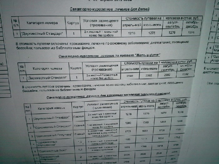 ценик на номера списал с прейскуранта (ценик указан для санаторно-отдыхающих видимо кто башляет наличкой захотел отдохнуть плати) а в моей путевке все есть проживание в номере на два человека подселили соседа .питание и процедуры но можно доплатить из своего кармана и снять номер . и пришлось только обраться о сюда за свой счет . а для тех кто по путевке номера на порядок дешевле . -------------------- изготовление ключей по замку