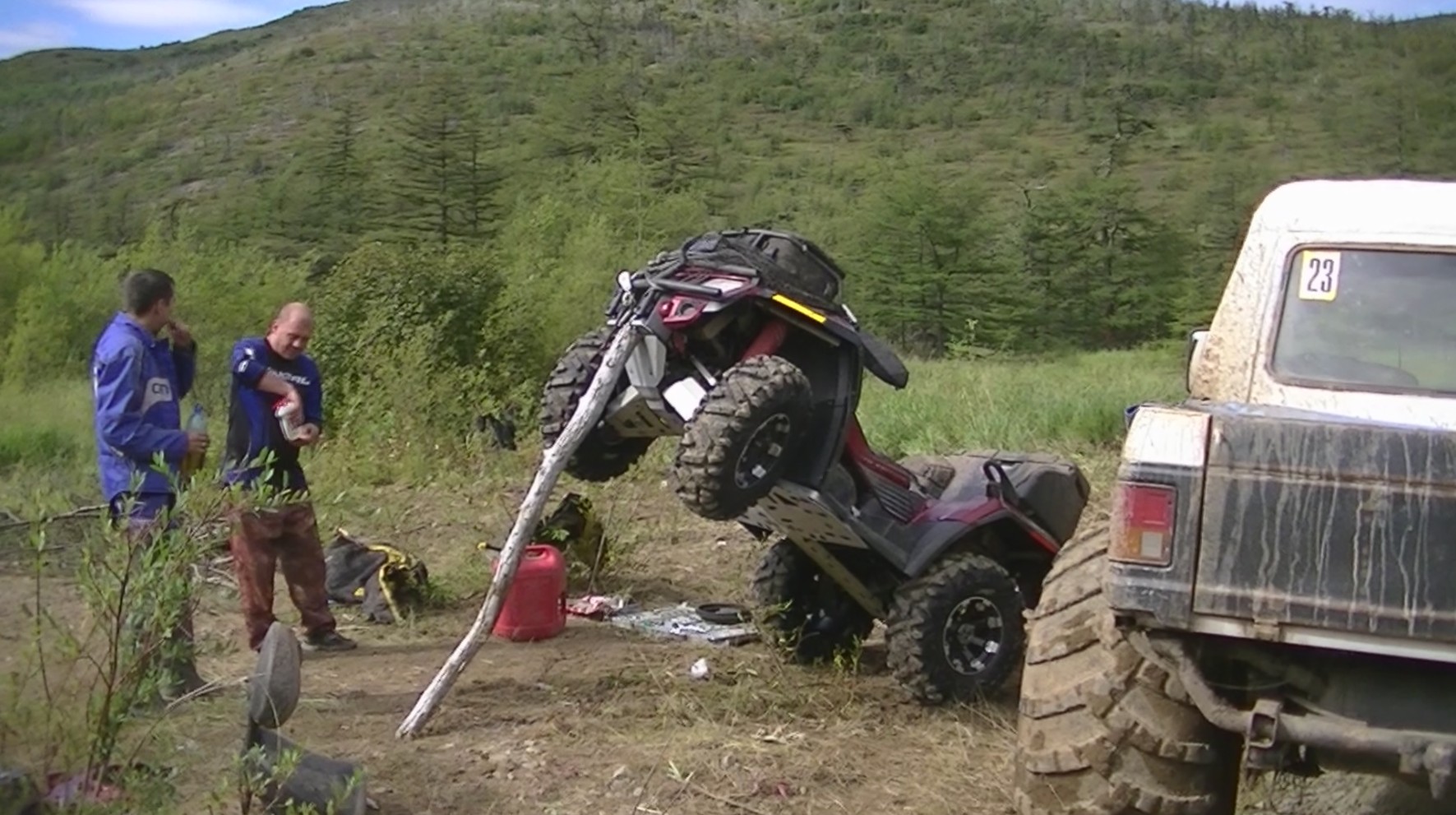 квадрик хлебнувший воды по предположениям в Адыкчане, как потом выяснилось - в Атарганском распадке. Вот он и не лез в сопку. Вдобавок, забыли масло для квадрика. Попытались на Атаргане разжиться - аборигены зажали, предлагали слить с Москвича, а сами разбежались. Пришлось тащить квадрик на галстуке до Олы. За Берёзовым распадком и Колян (Эскудо) подоспел с маслом. |