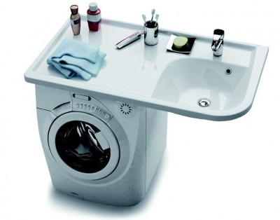 dmitrii, ИМХО, нормальная идея. Нужна специальная раковина с задним сливом и желательно стиральную машинку глубиной не больше 45 см. Кран лучше, монтируемый в стену.
