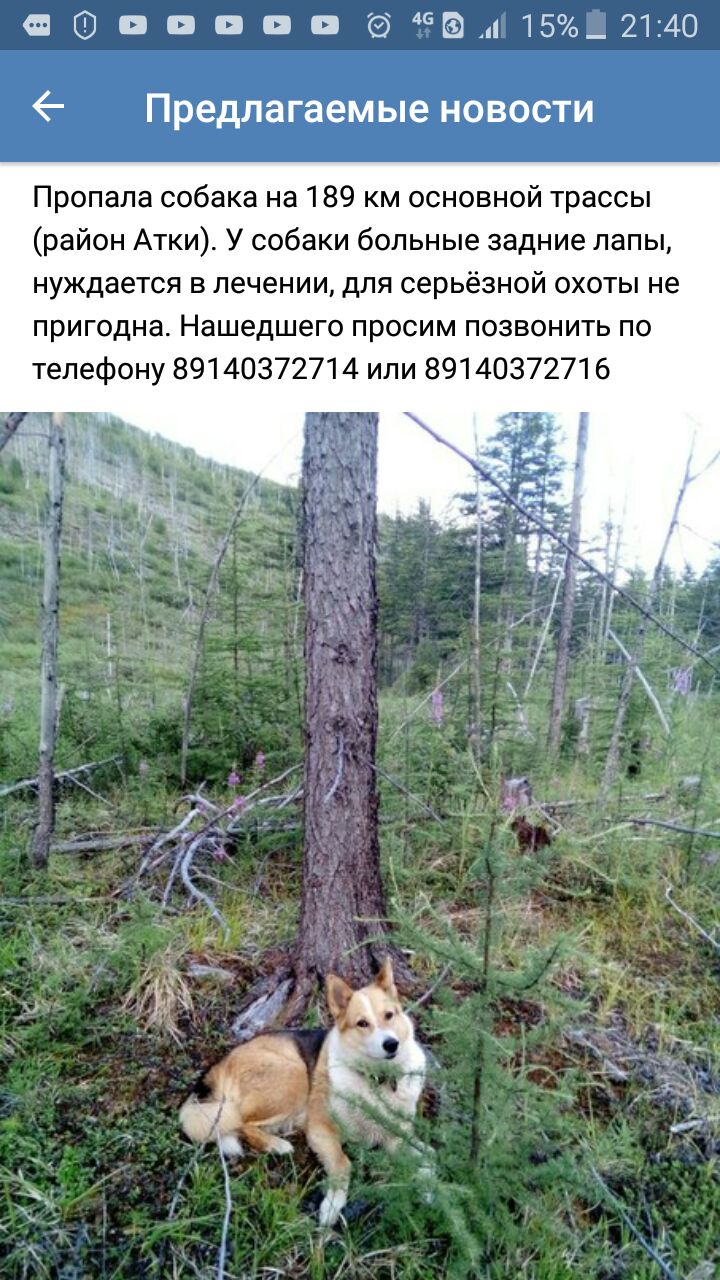 В районе Эликчана найдена лайка трёхцветная с ошейником. Фотки чуть позже сделаю.