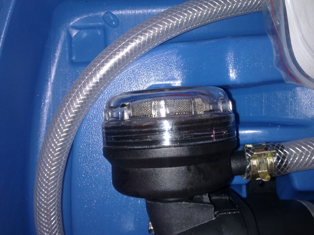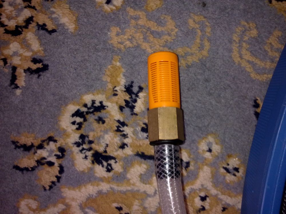 Шланг с оранжевым фильтром опускается в емкость с водой.