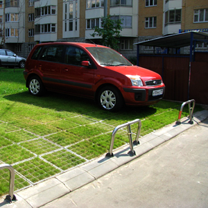 в землю с газоном вдавливают пластмасовые решетки зеленого цвета(чтоб с травой сливалось) с ячеей примерно 5 см. но при этом решетка на 2-3 см выше земли. газон растет сквозь ячеи а машины заезжают на решетку (фактически) . тоесть ставят на газон но он всегда зеленый -------------------- А У НАС ВСЕ ПУЧКОМ!!!