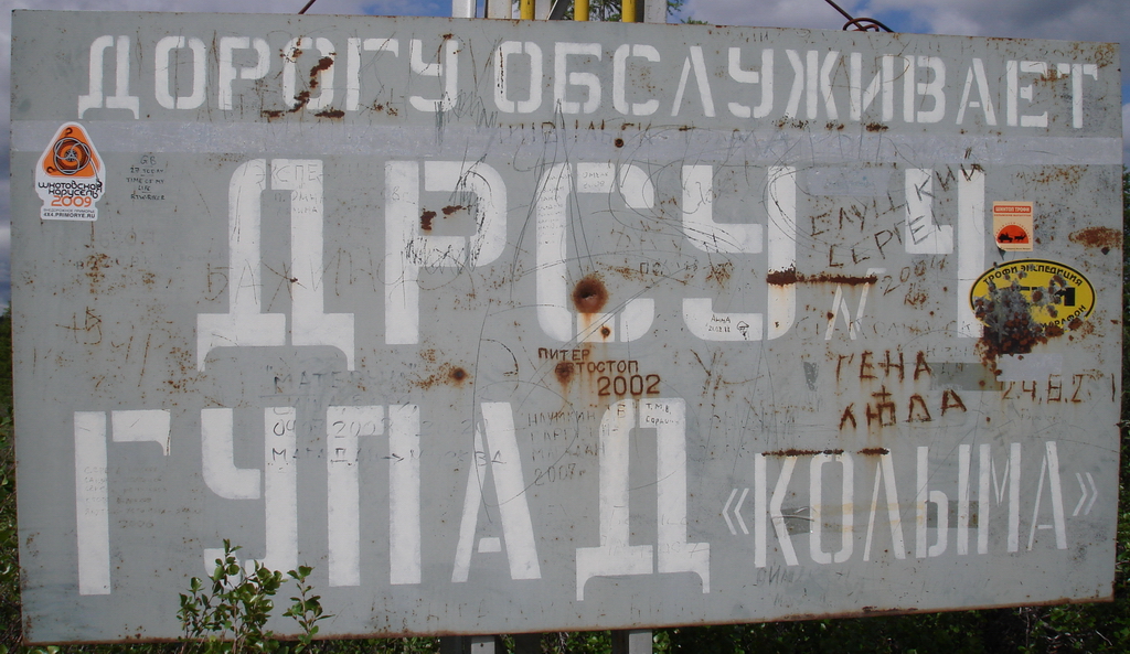 "Собирать камни" в туры - не у каждого мораль на таком высоком уровне. Чаще будет случаться так, что из любопытства его раскидают и записку выкинут. Вот если бы у меня обсуждаемая наклейка в июне была бы, то, на этом памятном указателе на въезде в Оймяконский район уже присутствовала бы. Ну или на противоположном, стоящем на въезде в Магаданскую область. |