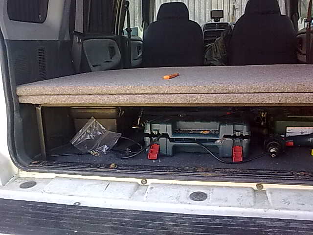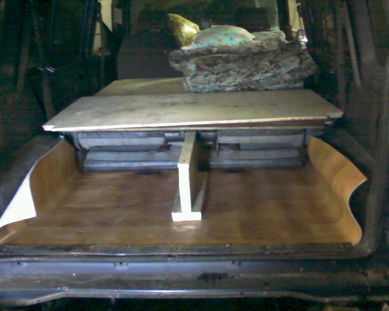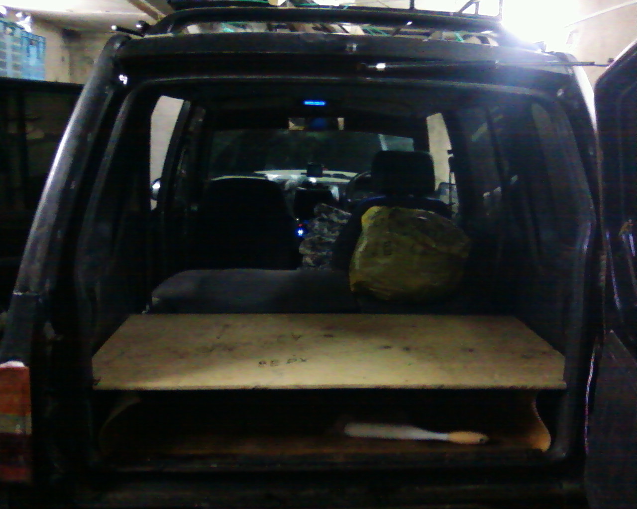 Так как регулярно приходится выезжать за пределы города (рыбалка, охота и.д.) и ночевать в машине, решил я сделать спальное место в своем авто, т.к. на сиденьях спать не очень удобно (при этом задние сиденья снял вообще). Вообщем сварил рамку из трубы профильной 20Х20, покрасил, прекрепил к кузову (чтоб не прыгала) сверху сделал настил из фанеры (10 мм). Насил сделан из двух частей: 1-я часть прикреплена шурупами у металической рамке, а вторая часть ложится сверху. При необходимости ночлега, вторая часть настила устанавливается между рамкой и креслами авто (заранее отодвинутыми до упора вперед и сложенных также вперед). Таким образом получаем спальное место в полный рост. Обшиваем для эффекта фанеру тканью (я обшил кавролином прорезиненным) и усе. При этом имеем нижне отделение для хранения инструмента, и т.д. Кстате сидя ехать при сложенной конструкции также можно.