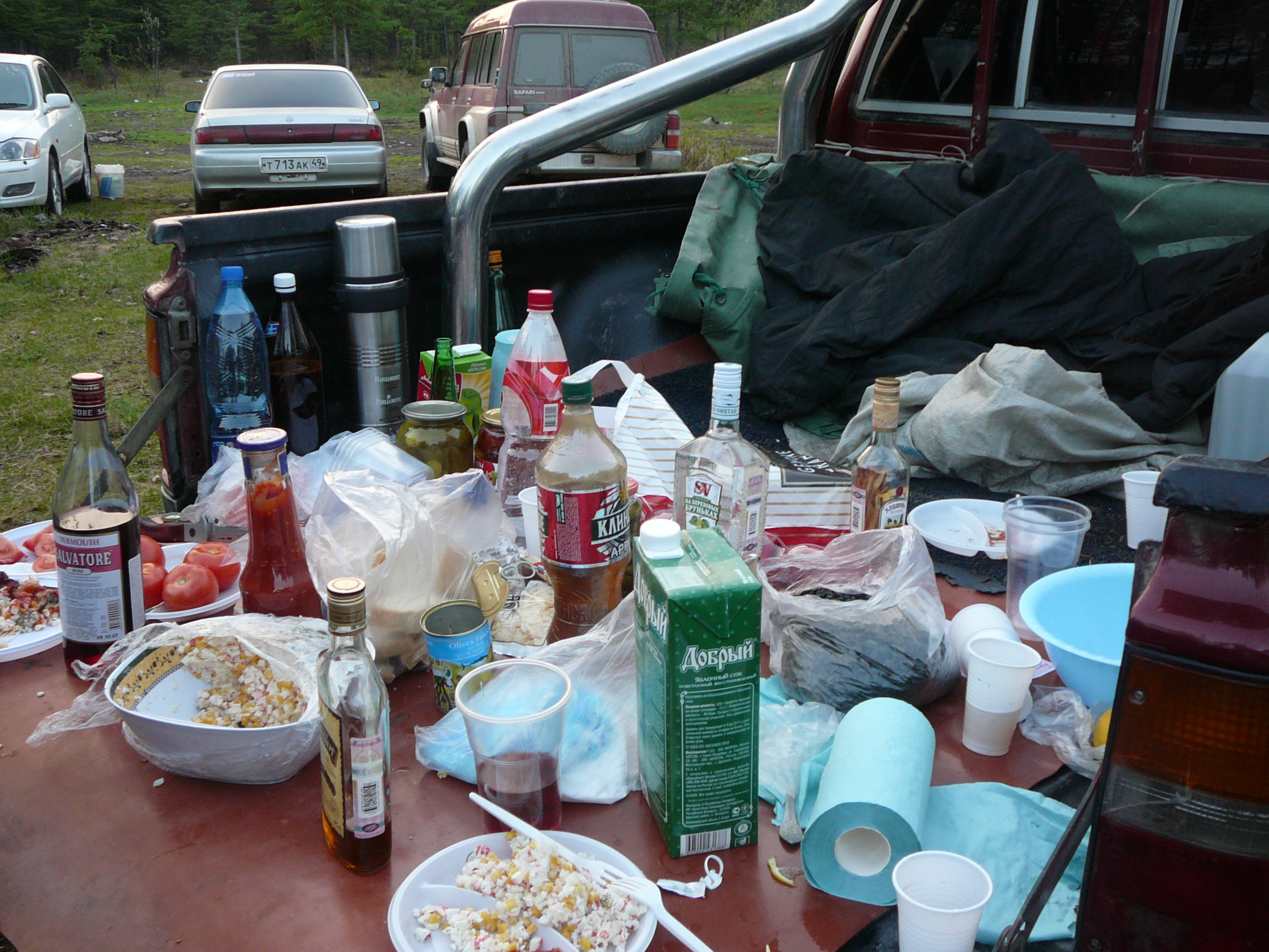 Итак: домкрат обычный, домкрат hi jack, спальник, три одеяла, бензопила, тосол, масло, инструменты, масло под бензопилу, топливо для нее же, два масляных фильтра, клавиатура, кртутилка под обычнй хайджек, еще одна запаска (первая на заней двери), набор для бортировки-рзбортировки, масло для коробки, две кружки, бутылка водки, куча болтов и шурупов, лишний конвертер, ведро, сумка под рыбу, удочка, два спиннинга, ящик с рыболовными снастями, теплая укутка под движку, войлок, брезент для укутывания машины, спальный матрасик - самонадувающийся..., тарелка, свитер, тельник, гидробелье.... ну и так по мелочи... как бы при этом - так как (спасибо, Кельт) сделан спальник - снаружи ничего не торчит.. и в багажнике еще куча места.... |