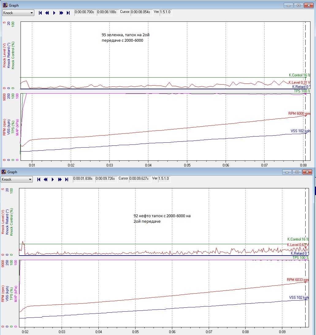 92 нефто пики датчика детонации 1.19 не были отрегулированы зазоры на клапанах 92 нефто пики датчика детонации 0.84 в среднем и один раз 1.05 выставлены зазоры клапанах 95 зеленка пики датчика детонации 0.80-0.98 выставлены зазоры клапанах В целом 95й на зеленке, лучше чем 92ой на нефто это исходя из колебаний датчика детонации, что касается общей картины 95 на нефто кажись децел но бодрее. -------------------- [Team Мирный Танк] [Guardians Of The Blind Team]