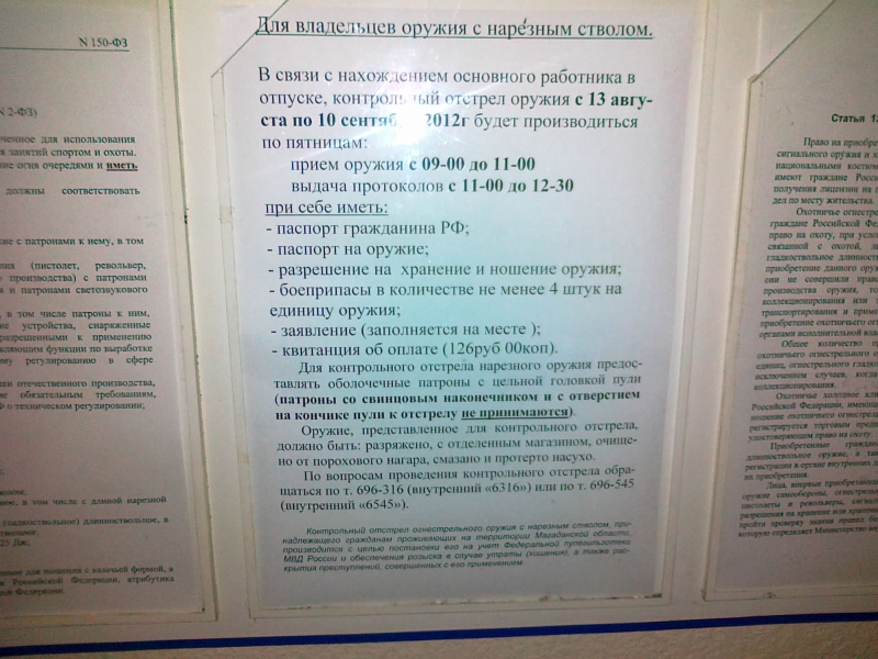 Благодарю за разъяснения. Продлеваю разрешение и имею гладкоствол = участники автофорума сэкономили мне 4 тыс. руб. да.. тоько не забудь сделать копию разрешения на гладкоствол и оригинал прихвати тоже.. ну чтоб два раза не ходить.. на стенде этого не написано.. а.. еще и фотки нужно не 2 шт а три.. я сдавал в четверг документы.. про фотки тоже на стенде не указано, что нужно 3 шт.. -------------------- Спасибо! — Xander