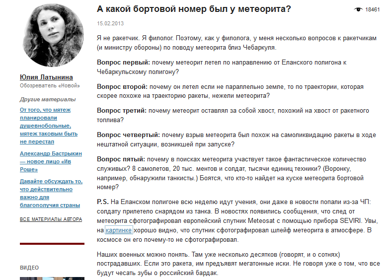 Позже давал интервью по телефону как-то астроном: "Радиактивных элементов в метеоритах данного типа нет и увеличения фона быть не может". Кому верить? А может это и не метеорит был? Отказала бы телефонная связь при сгорании метеора? По мне, так это скрытие чего-то серьезного. Учения... нло -------------------- |