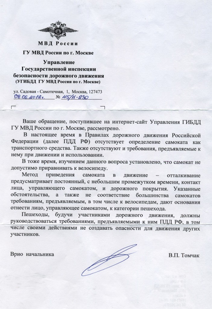 Цитата Довольно часто среди владельцев самокатов возникает вопрос – что такое самокат с точки зрения правил дорожного движения? Эту тему мы обсуждали не раз и к единому мнению так и не пришли, ведь, как и велосипед, самокат приводится в движение с помощью мускульной силы, так значит ли это, что на дороге самокат подчиняется правилам для велосипеда? В 2012 году мы отправили официальный запрос в ГИБДД Москвы, и ответ пришел! Полный текст ответа: «В настоящее время в Правилах дорожного движения Российской Федерации (далее ПДД РФ) отсутствует определение самоката как транспортного средства. Также отсутствуют и требования, предъявляемые к нему при движении и использовании. В тоже время, изучением данного вопроса установлено, что самокат не допустимо приравнивать к велосипеду. Метод приведения самоката в движение — отталкивание предусматривает постоянный, с небольшим промежутком времени, контакт лица, управляющего самокатом, и дорожного покрытия. Указанные обстоятельства, а также не соответствие большинства самокатов требованиям, предъявляемым, в том числе к велосипедам, дают основания отнести лицо, управляющее самокатом, к категории пешехода. Пешеходы, будучи участниками дорожного движения, должны руководствоваться требованиями, предъявляемыми к ним ПДД РФ, в том числе своими действиями не создавать опасности для движения других.» Похоже я один умею на самокате в нашем городе. -------------------- Политики – словно подгузники. Их надо почаще менять. И по той же причине.