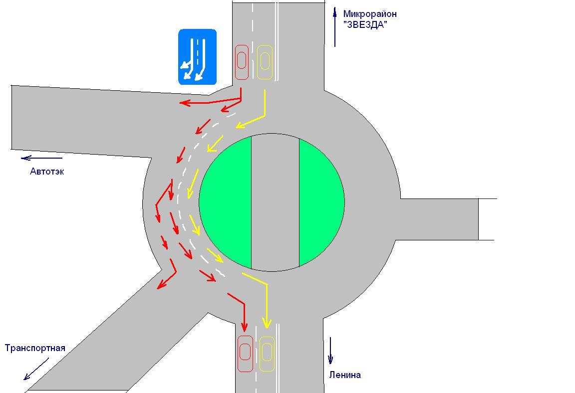 Да тот товарищ тогда явно вызвал негатив! После того как вы въехали, вновь сработает правило "крайних" положений. Поэтому покидать такой перекресток следует так же, как и обычный, предварительно прижавшись к правому краю." то есть получается, что водитель на желтой машине тоже прав? Т.е. он в процессе езды по кольцу показывает правый поворот, перестраивается на крайнюю правю полосу (там где едет красный автомобиль) и выходит с кольца опять же в крайнюю правую полосу ул. Ленина? Если так, то тогда намотаем на ус и будем ездить именно таким образом. Но с другой стороны как удобно ехать в два ряда и выходить с кольца на Ленина тоже в два ряда... пропускная способность такой схемы проезда намного больше, если конечно не мешают снежные заносы... |