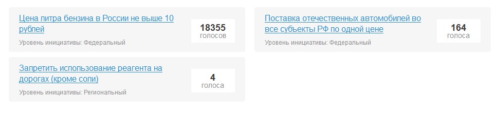 от Магаданской области там ща несколько "предложений" висит. есть и не совсем адекватные, на мой взгляд, вроде "Организация туристической добычи золота в Российской Федерации") про топливо есть вот такое "Цена литра бензина в России не выше 10 рублей" набрало уже 18356 голосов. чтоб инициатива попала на рассмотрение к правительству нужно вот такое: Цитата На федеральном уровне и в субъектах России численностью населения более 2 млн. – не менее 100 000 (ста тысяч) голосов в поддержку инициативы; На региональном и муниципальном – не менее 5% от численности зарегистрированного населения. еще несколько от этого же автора можно еще вот сюда подать ссылка доступна только зарегистрированным |
