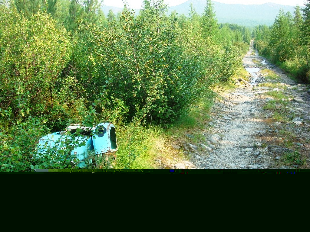 Давно я собирался на Джека съездить и вот дождавшись погоды , подшаманив ЛУАЗик ,26-07 2010 в 19-40 я стартанул из Синегорья . На мосту был в 21-00 , заправился , записал спидометр , перекрестился и ну попёрли.Ехал до Пламенного там заночевал в 23-00. В 6-30 меня разбудил ехавший с метео Сайгак, я встал, попил чайку и поехал далее, через 2 км объезд справа (нормальный).Сухахы воды мало проехал без проблем, на 23км длинные лужи с объездом по левой стороне, сам объезд весь в глубоких колеях, пешком наметил путик подпилив мешающий стланик и ходом проскочил.До руч Снежный (36км),несколько объездов сгнивших мостов, то валуны то лужи а местами хорошая дорога я даже третью втыкал.На Снежном в 11-00 встретились мне Сайгаки с Боевого, вывозили детей домой. Я расспросил у водителей про дорогу, они меня успокоили и объяснили где и как проехать.А сами облепили Луазик и как дикари ух-ты ах-ты. Пообедав двигаю далее, начинается валуньё , следующие 5км до ( Игуменки) я ехал 2 часа. По валунью строил дорогу себе,ямы закладывал а въезды на валуны делал пологим. Игуменка это как я понял длинное болото перед перевалом, болото было высохшим и проехал без проблем, там ещё объезд по левой стороне был но я поехал на прямки. На 46км меня обогнала Нива с Магадана, на 15й резине для асфальта ,мужик говорит мол нормально едет. В 15-00 добрался до егерьского участка, приделал табличку М-49, Джек весь в дыму, фотки не ахти. Видел (не знаю как назвать) ярлычок от Мотопутешественников, я их три штуки видел.Еду далее, спуск весь в валунах и крены очковастые.На объзде по торфам сломал правую рулевую тягу, повезло что возле резьбы, я напильником нарезал ещё несколько витков, затянул и хватило аж до дому.В 17-30 я плыл уже по оз Танцующих-хариусов,и плакал от счастья. На Боевом был до 29-07,пил пиво, купался, лазил по округе, на лодке по озеру катался. Рыбу не ловил она ушла Кульсьен,да и сил не было после дороги,жил в 6м домике куда меня Серёга (охранник)поселил. 29-07 в 12-00 я стартанул до дому,до егерьского уч-ка 3км подымался три часа, движочку в 40л/с тяжковато.Да ещё и за тягу переживал. Через 10км на спуске с перевала в 17-10, встретил двух заряженныж джипов.В 19-00 на Снежном, с голодухи объелся голубики.В 22-00 переехав Сухахы, встал ночевать, на костре нагрел чаю, тушенки.Тока улёгся спать и тут выходит медведь, обнюхал из далека, потом под машиной доел тушёнку, переворошил посуду и ушол.У меня так тряслись руки что получились тока 3 фотки, остальные размазанные.Еле уснул, ещё как назло захотелось в туалет. Утром в 10-00 двинул далее, в 12-30 был на мосту . По моему спидометру от моста до Боевого 52км. Вот малость фоток,буду дополнять.