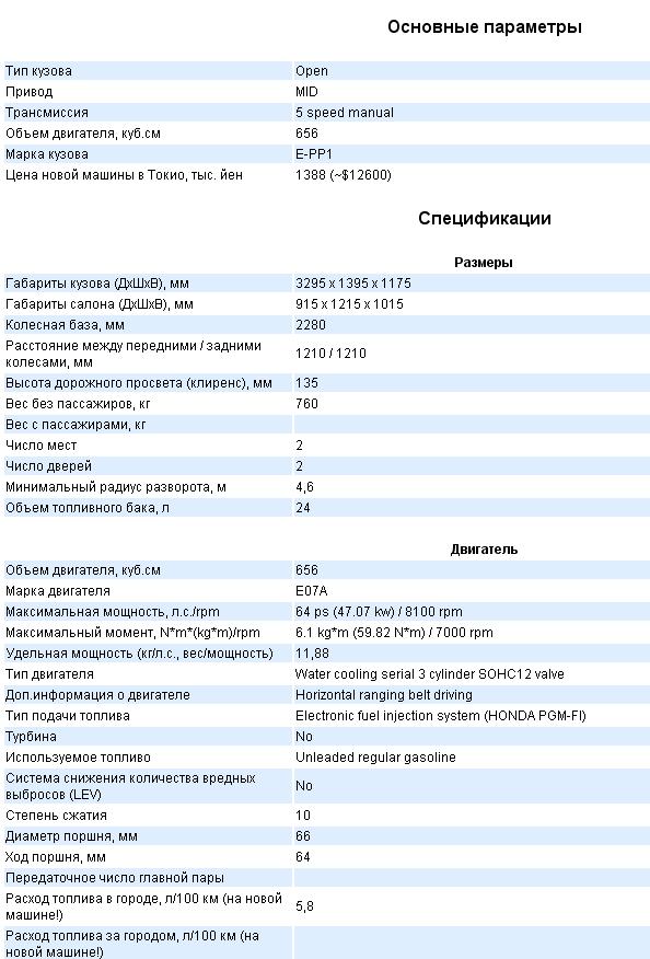 Но это страсть сильнейшая! — любить Необходимость мне; и я любил Всем напряжением душевных сил." М.Ю. Лермонтов [attachment=63664:88cc17e8...original.jpg] [attachment=63663:88cc17e8...original.jpg] [attachment=63665:88cc17e8...original.jpg] [attachment=63670:88cc17e9...original.jpg] [attachment=63671:88cc17ea...original.jpg] Концерн Honda, которому в 1990 году благодаря NSX удалось покорить вершину в производстве спортивных машин, не остановился на достигнутом и уже через год создал новое имя, до сих пор известное в мире легких малолитражных спортивных моделей. В 1991 году появился первый среди «малолитражек» 2-местный спортивный автомобиль открытого типа – Beat.Концерн Honda, которому в 1990 году благодаря NSX удалось покорить вершину в производстве спортивных машин, не остановился на достигнутом и уже через год создал новое имя, до сих пор известное в мире легких малолитражных спортивных моделей. В 1991 году появился первый среди «малолитражек» 2-местный спортивный автомобиль открытого типа – Beat. Благодаря 3-цилиндровому 12-клапанному атмосферному двигателю SOHC MTREC Beat развивает мощность в 64 л.с., что на тот момент являлось наивысшим показателем среди компактных малолитражных машин. Благодаря этому двигателю водитель сможет остро ощутить все прелести спортивной езды. Если открыть огромную дверь Beat, похожую на дверь NSX, и сесть в салон автомобиля, то в глаза сразу бросается маленькая панель приборов, в которой есть что-то (скорее всего, размеры), заставляющее вспомнить о мотоцикле. Сев в кресло водителя и взявшись за ручку переключения передач, вы почувствуете, что ваше сердце начинает биться сильнее обычного, предвкушая быструю, легкую езду. По своим ходовым характеристикам Beat несколько проигрывает турбированным машинам, однако трудно найти другой автомобиль, который двигался бы так легко. Кроме того, Beat легко узнаваем благодаря своему оригинальному внешнему виду, который не встречается у других «малолитражек». КУЗОВ Тип кузова Родстер Количество дверей 2 Количество мест 2 Длина 3295 мм Ширина 1395 мм Высота 1175 мм Колесная база 2280 мм ДВИГАТЕЛЬ Модель двигателя E07A Расположение двигателя Спереди, поперечно Объем двигателя 656 см3 Мощность 64 л.с. При оборотах 8100 Крутящий момент 60/7000 н*м Система питания Распределенный впрыск Наличие турбонаддува - Газораспределительный механизм SOHC Расположение цилиндров Рядный Количество цилиндров 3 Диаметр цилиндра 66 мм Ход поршня 64 мм Количество клапанов на цилиндр 4 Топливо АИ-95 ТРАНСМИССИЯ Привод Задний Кол-во передач (мех коробка ) 5 ЭКСПЛУАТАЦИОННЫЕ ПОКАЗАТЕЛИ Расход топлива на шоссе 3.7 л/100км Расход топлива Смешанный цикл 5.8 л/100км Снаряженная масса автомобиля 760 кг Сообщение отредактировал Shiko - 3.9.2010, 15:54 -------------------- «Ад и рай – в небесах», - утверждают ханжи.