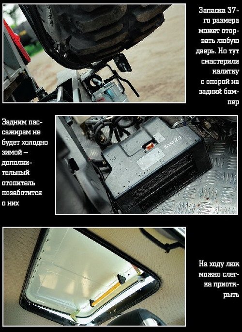 Автомобиль предполагалось использовать на дороге и бездорожье – не для спорта, но для охотничье-рыболовных забав. Такой развлекательно-оздоровительный вариант. Лифт подвески – проставки под кронштейнами серег рессор. Это грамотнее, чем длинные серьги, – управляемость здесь и так не очень, зачем ее дальше ухудшать. Лифт кузова на 100 мм реализован, естественно, с помощью проставок. Итог – колеса SuperSwamper Bogger диаметром 37 дюймов. Мосты портальные. Угол продольного наклона шкворня увеличили на 6 градусов, что прибавило курсовой устойчивости. Блокировки нижегородского производства довели до ума, добавив им работоспособности. Еще: силовой обвес, лебедки спереди и сзади, пол обработан противошумной изоляцией и закрыт рифленым алюминием – стандартный тюнинг «УАЗа». Расширители на два с четвертью дюйма. Шноркель вполне утилитарного вида и дизайна – прочный, дешевый, эффективный. Карбюраторный мотор заменили современным инжекторным, ульяновского же производства. Добавили отопитель задней части салона и подогрев сидений. Очень удобен люк от автобуса «ПАЗ» – можно приоткрыть для проветривания, можно откинуть для стрельбы или фотосъемки. Бортик по краю не даст затечь воде. Cамое же главное – автоматическая подкачка колес, новая разработка фирмы. Справа от остальных приборов поселился манометр, а спереди перед рычагами КПП и РК – краники. Можно, не выходя из салона, замерить давление в любом из колес, подкачать их – каждое в отдельности или все сразу. Еще одна важная мера для повышения проходимости – увеличенное с 1.98 до 2.98 понижение в раздаточной коробке. НЕ СПАСАЕТ ПОНИЖЕНИЕ Стоит ли удивляться, что мне нетерпелось опробовать этот замечательный аппарат. Мы выдвинулись на нем в сторону небольшого прудика невдалеке от мастерских. Сдвоенные амортизаторы заставили работать подвеску, машина не прыгала! Затем нам путь преградили бетонный блок и вбитые штыри. Так, слегка приспустив шинки, пытаемся перелезть через блок с краешку. Не выходит! И увеличенное понижение в РК не спасает – не едет на низах даже инжекторный «УАЗ». Пришлось газануть. Четыре Bogger’а, провернувшись, выплюнули по кубометру грунта. «Уазик» двинулся на полметра вниз. И сел на порог. Приехали... Зато в грязи и колее на нем будет хорошо, если ехать немного ходом. В общем, приятно удивил меня «УАЗ». |