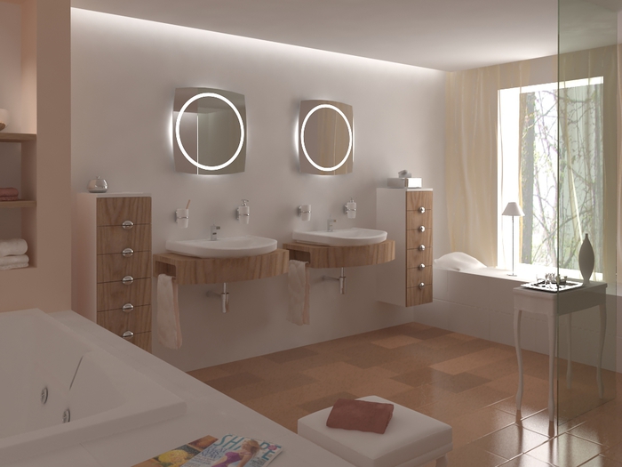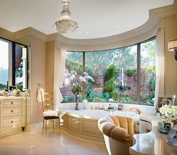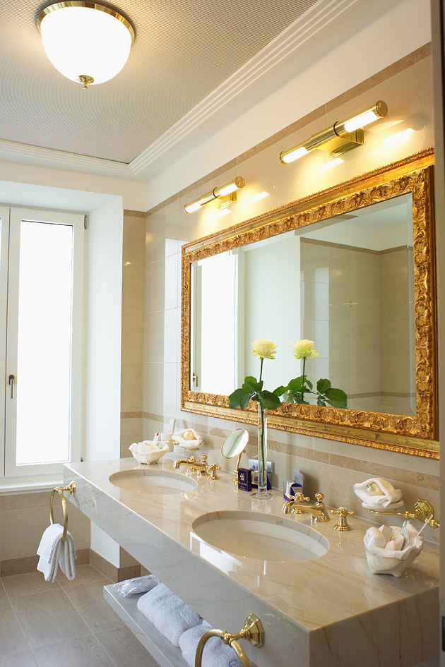 Очень нравятся в ванной комнате порталы с утопленные в них умывальниками.