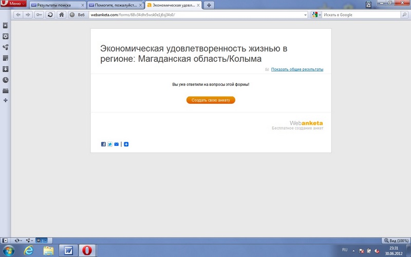 У меня с первого раза открылось. Это же студент, а не социолог, видимо, диплом уже готов и нужно просто вставить ответы на конкретные вопросы. Работа - не дипломная , а курсовая. Обычно в таких случаях используют уже готовые результаты чужих опросов , а здесь человек претендует на самостоятельность работы. Может , и выйдет что толковое. Правда , дальше деканата такие работы не идут, но чудеса иногда нет-нет , да и происходят. |