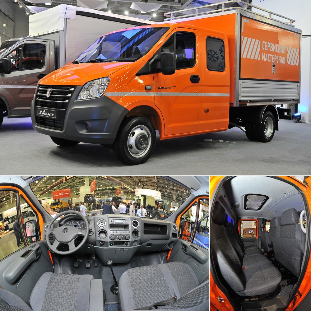 В тот момент, когда «легковая» общественность внимательно рассматривала новинки Франкфурта, «грузовой» автомир следил за другой выставкой — столичным биеннале Comtrans’2013. И хотя наш проект обычно не уделяет внимание грузовикам, мимо этой выставки мы пройти не смогли: здесь Горьковский автозавод презентовал целую россыпь «легковых» новинок! Производство Газели-Next стартовало весной — тогда заводчане презентовали только короткобазный бортовой грузовик. Чуть позднее появилась длиннобазная версия, которая вовсю продаётся, а сейчас завод представил грузовичок со сдвоенной кабиной, маршрутку, автомобиль скорой помощи и даже новое поколения трудяги «газона», который получил кабину от Некста. Новая маршрутная Газель: с ABS и высоким потолком Прежняя маршрутная Газель создавалась фактически от безысходности. Стране понадобились автобусы малой вместимости, и самым простым решением было построить такую технику из обычного фургона: врезать стёкла, установить сиденья... Машина получилась тесной и не самой удобной. В полный рост внутри такого автобуса не встанешь, двери открывают сами пассажиры. Поэтому, когда на рынке массово появились более вместительные фургоны иностранных марок, Газели начали сдавать позиции. На привычные маршрутки пассажирская версия Газели-Next похожа мало. Тех, кого смущает некстовская «высоколобость», успокоим: управляемость автобуса оттачивали на одном из европейских полигонов совместно с европейскими же специалистами, так что излишней склонностью к опрокидыванию 18-местная машина отличаться не будет. Также со временем появится опционная система стабилизации (над этим уже работают газовские инженеры), так что Некст станет ещё безопаснее. Выпуск автобусов ГАЗ не планирует отдавать на откуп частникам, а займётся производством пассажирских машин самостоятельно, на производстве спецтехники. Версия для городских перевозок — только начало. Уже готовы пригородный вариант на 18 посадочных мест, корпоративный, туристический и школьный (на фото — слева) автобусы Нет, газовцы, конечно, пытались создать каркасно-панельный автобус (эта технология подразумевает постройку специального пассажирского кузова на «голом» шасси), но прежнее поколение «полуторки» не подходило для подобных целей — в первую очередь, машине банально не хватало тормозов! Зато новейшая Газель-Next для таких переделок подходит идеально, поскольку конструкция шасси изначально рассчитана на 4200 кг полной массы, а значит, по тормозам появился достаточный «запас». Последние, кстати, оснащены ABS. Чтобы не отвечать на многократно повторяющийся вопрос, как устроена Газель-Next, газовцы привезли на выставку «препарированное шасси»: дескать, смотрите, изучайте, делайте выводы. Жёлтым, кстати, выкрашены стабилизаторы поперечной устойчивости, которые не всегда встретишь на коммерческой технике! Делается пассажирский Некст по технологии «больших автобусов»: на шасси монтируется стальной каркас, на который навешиваются панели из оцинкованной стали (капот и боковины) и пластика (крылья, передняя и задняя панели, крыша). Другие признаки «настоящих автобусов» тоже присутствуют: передняя распашная дверь — с электроприводом, высота салона — внушительные 190 см, над креслами «протянуты» поручни. Самих кресел — 18, плюс один человек может ехать стоя. Впрочем, 