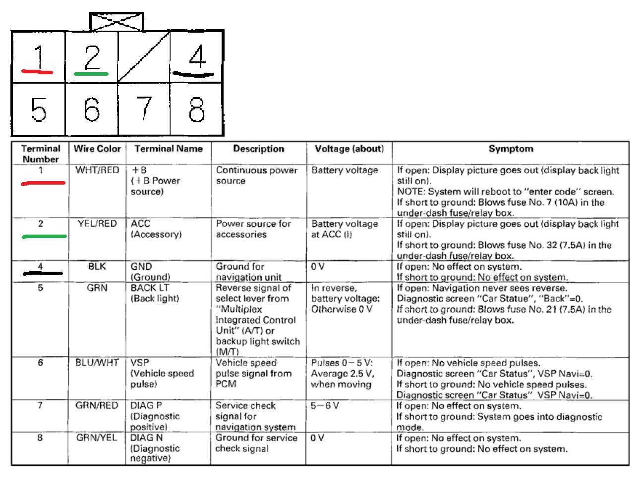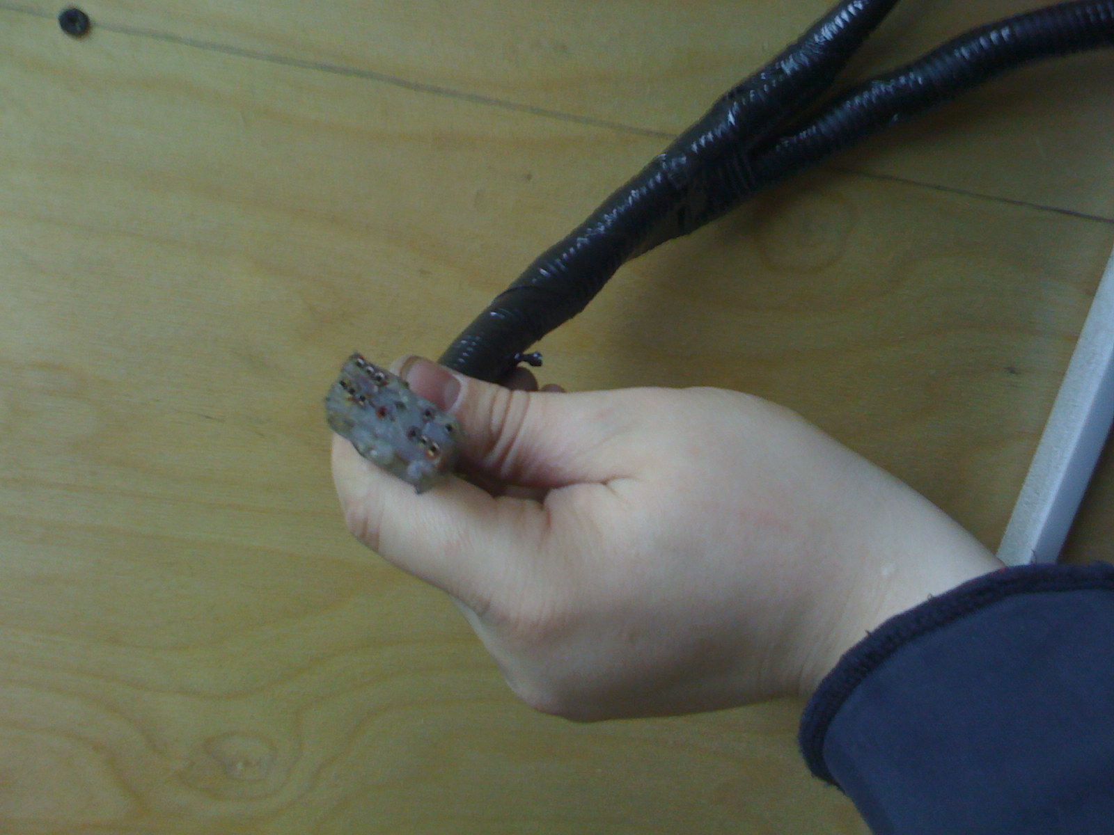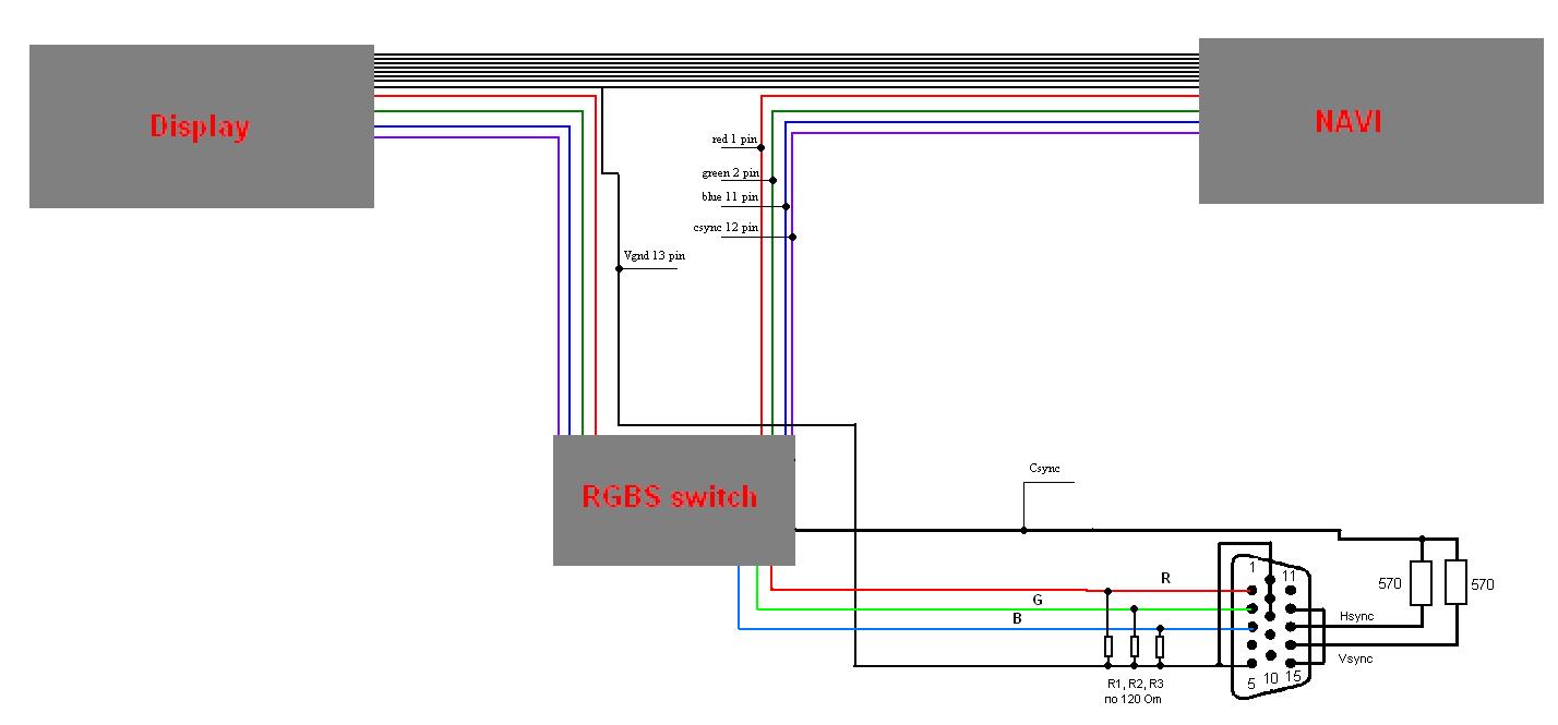 В связи с тем что не раньше я не умел разбирать фишки правильно, то разбирал их при помощи молотка При помощи термопистолета по известной ранее технологии изготавливаются нужные нам фишки Вот что получим после разбора фишки. В общем вот принципиальная схема подключения Т.к. мой бортовой видик на буке не умеет замешивать композитную синхру, то вертикальная и горизонтальная запускаются через два резистора. Иначе же можно было просто взять 13ый пин. Вот необходимые пины на нашем навигационном блоке. В принципе можно было бы порезать штатную косу, но я рад что я этого не сделал. Далее чтобы запитать RGB свитч, я снял ACC, +12 и землю с 8ми пинового разъема навигационного блока. +12 вольт я разорвал кнопкой установленной в подлокотнике, чтобы можно было переключаться между navi и rgb сигналом с бука. Процесс изготовления фишек повторно я описывать не буду ибо он есть в сообщении ссылка доступна только зарегистрированным В последствии всю проводку я упаковал в гофры. Сообщение отредактировал Maledict - 28.4.2009, 1:18 -------------------- [Team Мирный Танк] [Guardians Of The Blind Team]